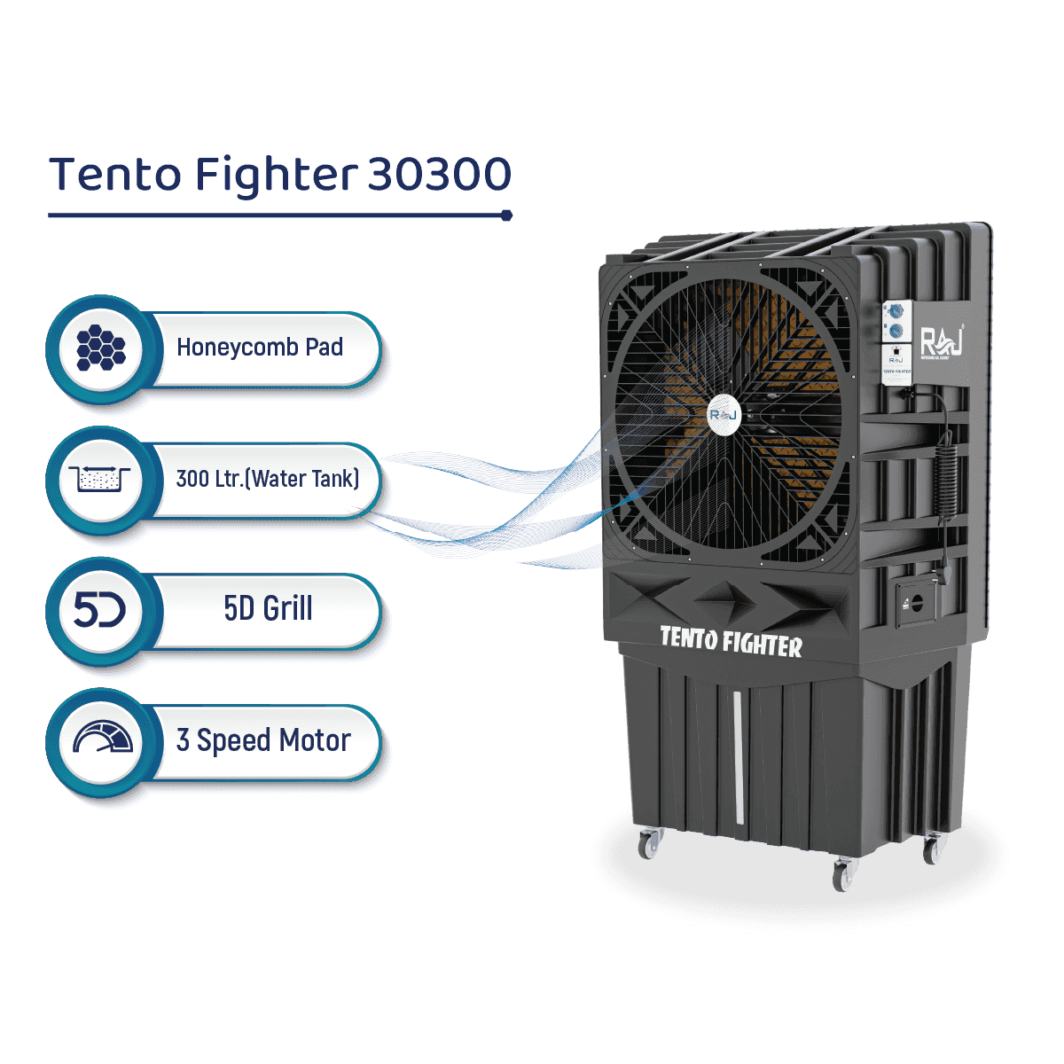 The TENTO FIGHTER 30 features a cooling pad size of 1100 x 1150 x 100 mm, maximizing cooling efficiency for optimal comfort in hot weather conditions. With a 280-liter capacity and a gross weight of 65 kilograms, it is built for reliable and powerful cooling performance, perfectly suited for your tent industry needs.