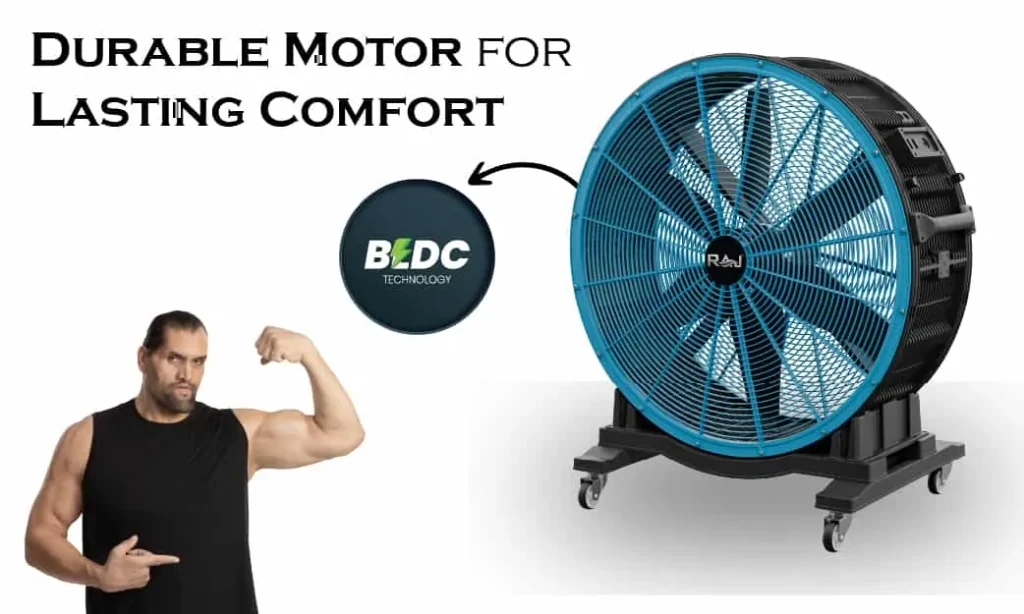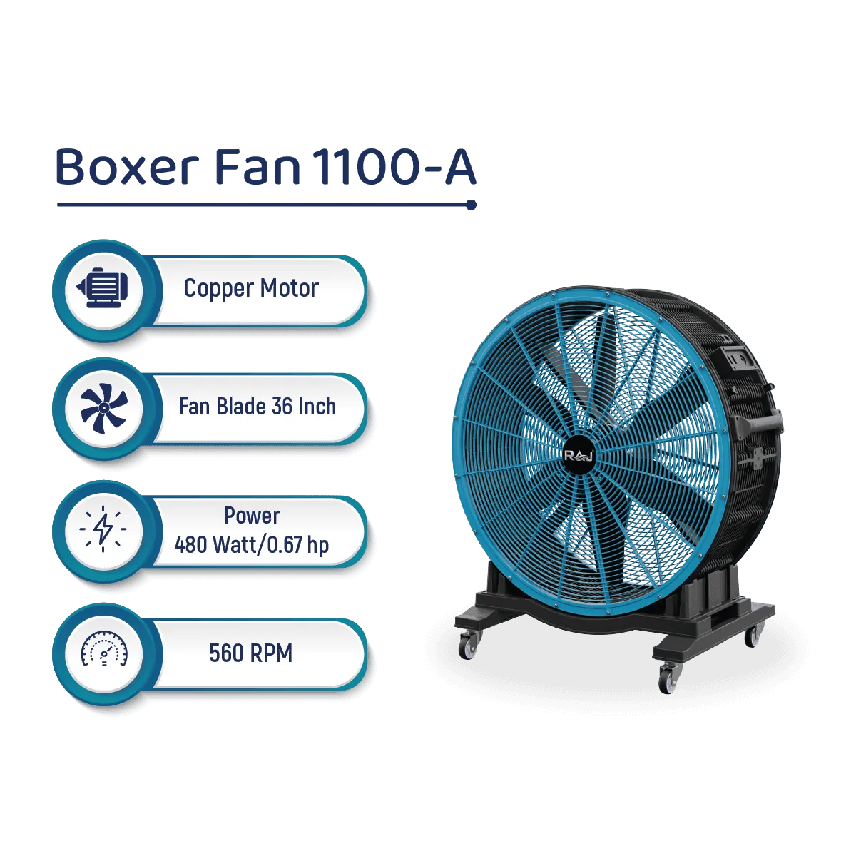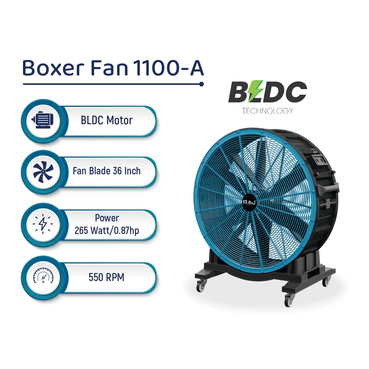 The BOXER FAN 1100-A comes with a BLDC motor with enhanced energy efficiency and silent operation and is engineered to have a broader lifespan than regular motors. The 265W power and 0.87 horsepower BLDC motor offers consistent airflow functionality with optimized electricity usage and is therefore ideal for extended-period daily consumption.