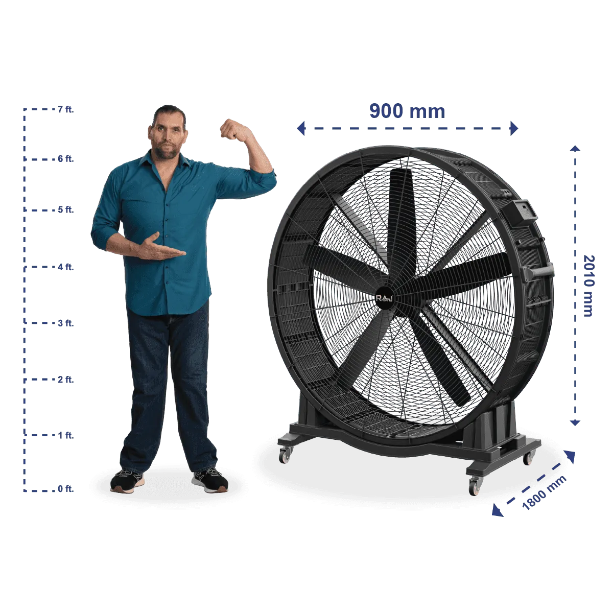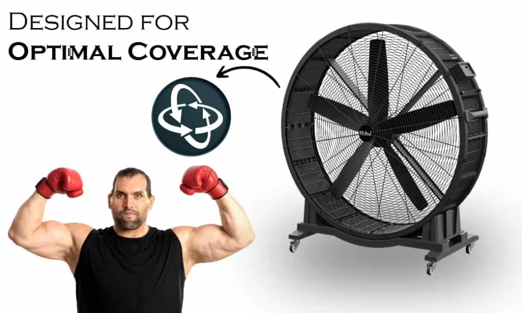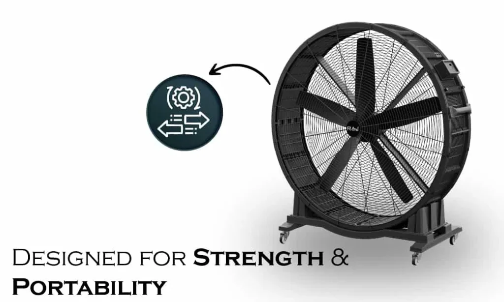 Weighing 75 KG, this fan is both sturdy and stable, capable of handling continuous high-speed operation without excessive vibration. Despite its hefty build, the integrated mobility wheels make it easy to reposition as needed. Whether for permanent setups or temporary arrangements, the BOXER FAN 1800 delivers reliable cooling with the convenience of portability.