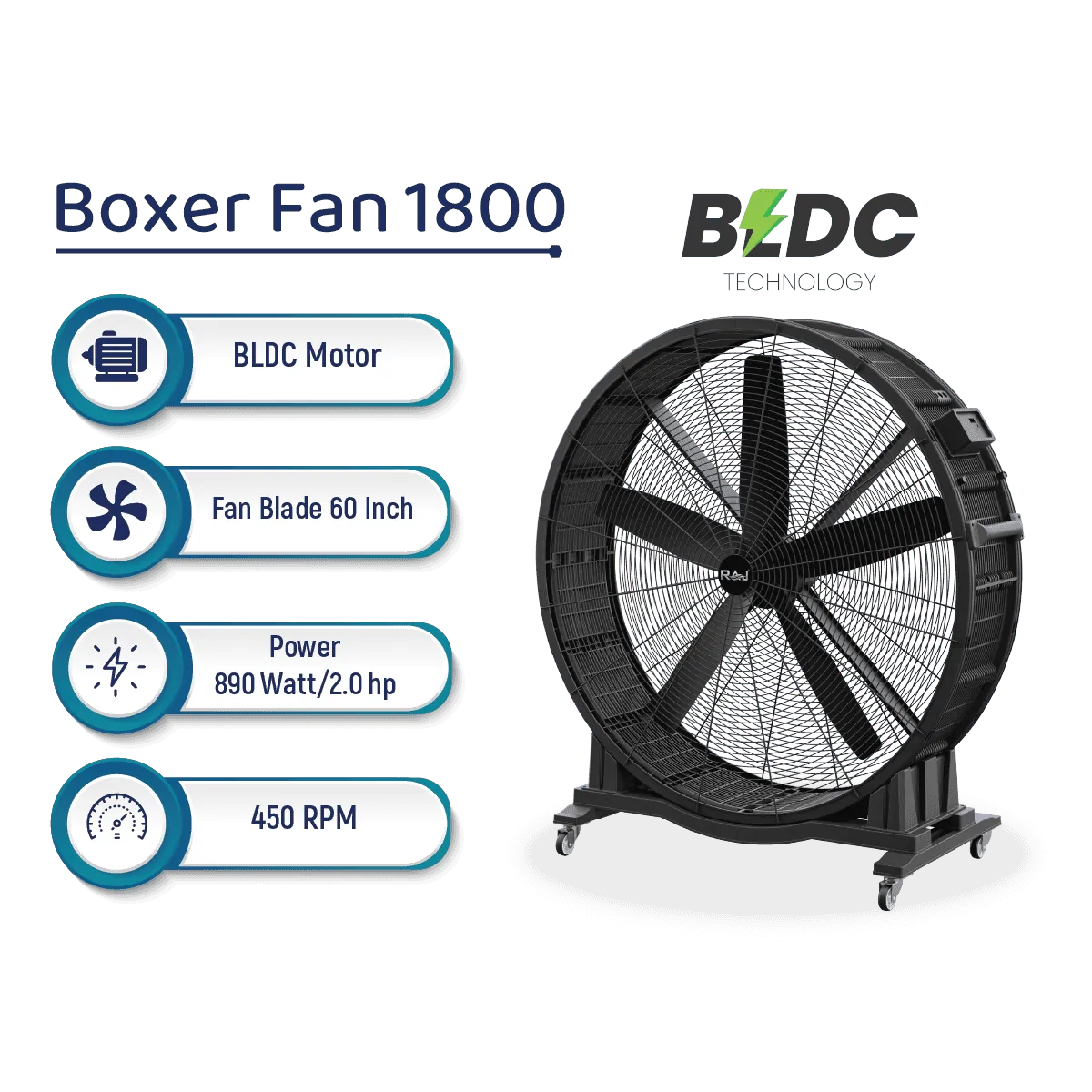 The BOXER FAN 1800 is built for industrial giants and large commercial environments where powerful airflow is essential. Its advanced BLDC motor operates efficiently, providing a strong 600-watt power output backed by 0.80 horsepower. This fan is engineered to deliver unmatched cooling performance in the most demanding conditions.
