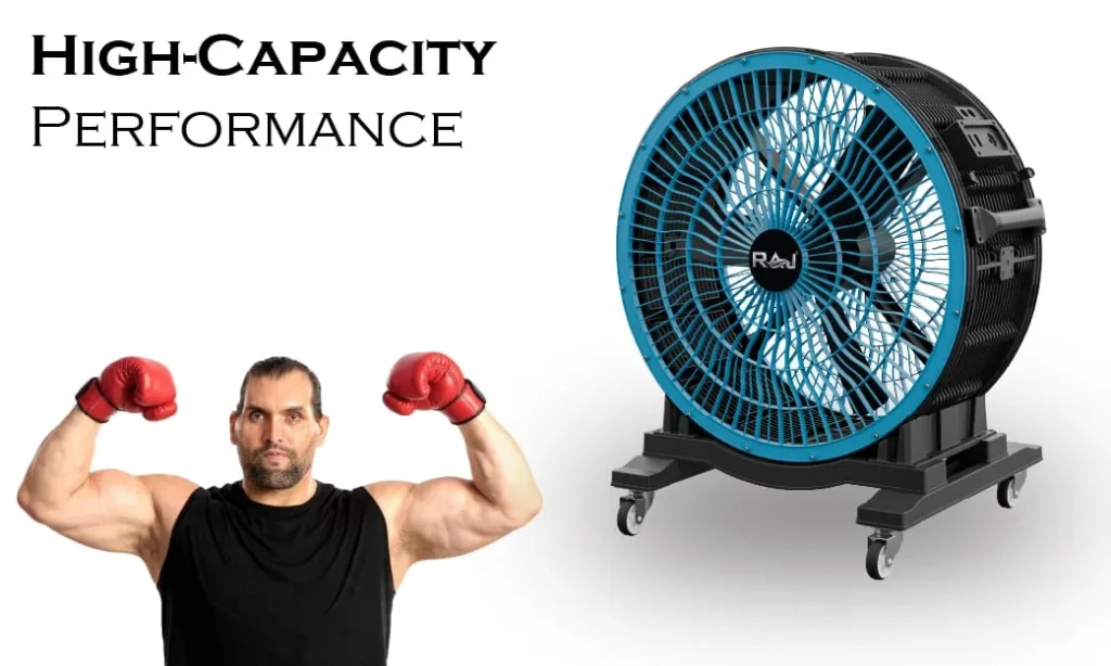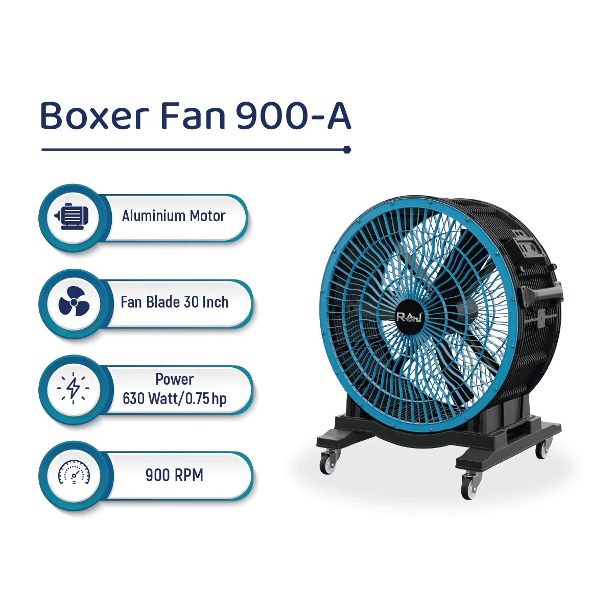 The BOXER FAN 900-A is particularly ideal for heavy-duty cooling applications with its heavy-duty aluminium motor to offer long-lasting performance. It is powered by 550 watts and has 0.75 horsepower capacity and is capable of generating heavy airflow while being energy efficient and commercially and industrially appropriate.