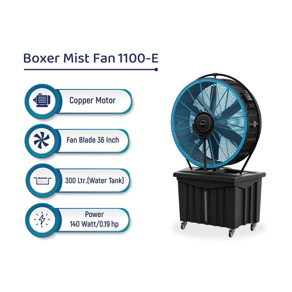 The BOXER MIST FAN 1100-E is a perfect blend of efficiency and power, equipped with an advanced BLDC motor that ensures energy savings without compromising performance. Its 140-watt power rating and 0.19 horsepower capacity make it an ideal choice for delivering high airflow while keeping electricity consumption low.