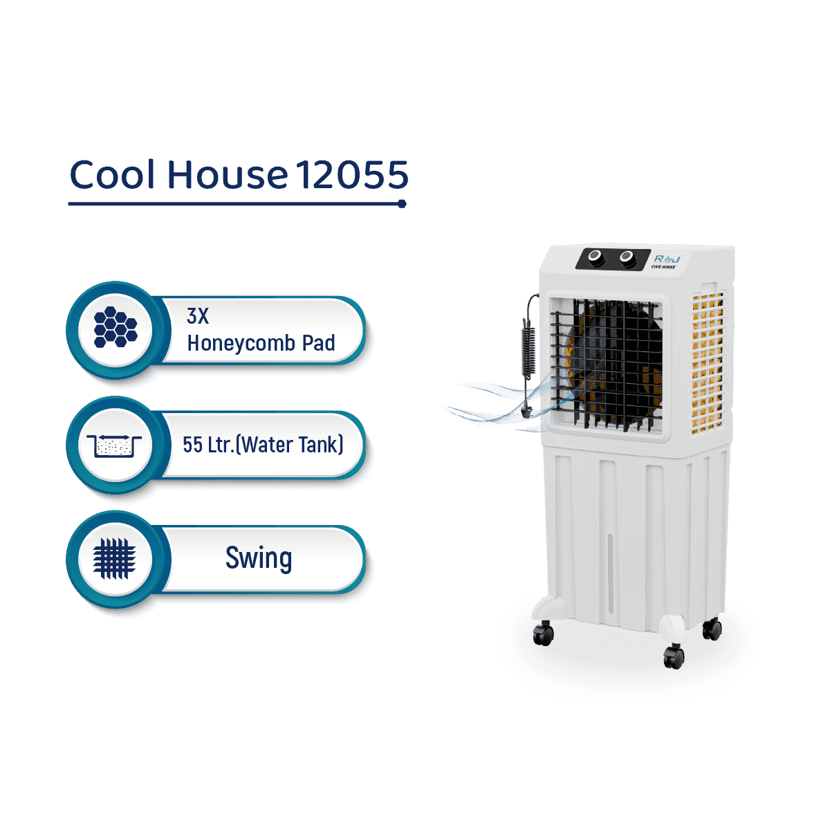 Break free from the limits of traditional air conditioners and enjoy the easy convenience of the Cool House(55 Ltr) Air Cooler. Compact and lightweight, it smoothly moves on sturdy wheels to bring cool air wherever you need it. Whether you’re cooling down a room or making your patio more comfortable, the Cool House(55 Ltr) is your go-to solution for staying cool.
