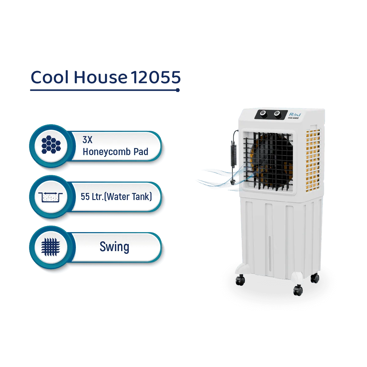 Break free from the limits of traditional air conditioners and enjoy the easy convenience of the Cool House(55 Ltr) Air Cooler. Compact and lightweight, it smoothly moves on sturdy wheels to bring cool air wherever you need it. Whether you’re cooling down a room or making your patio more comfortable, the Cool House(55 Ltr) is your go-to solution for staying cool.