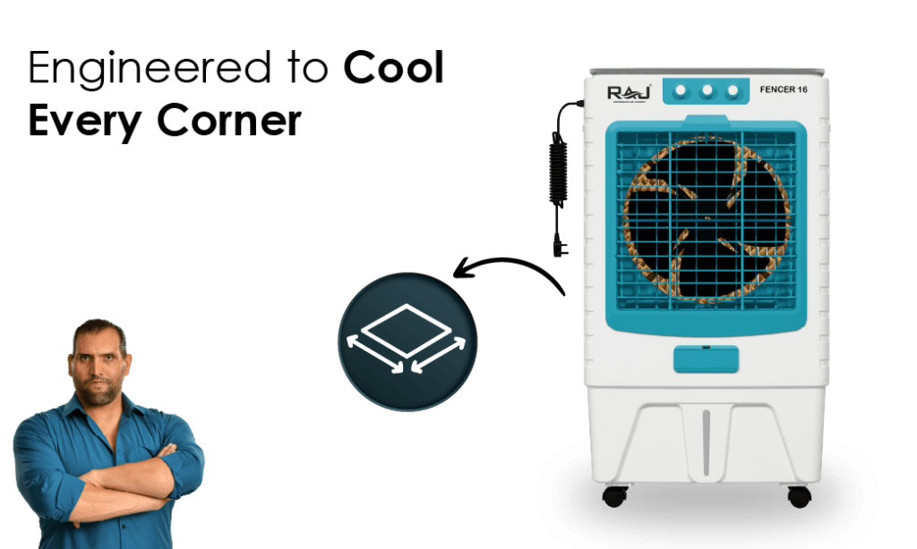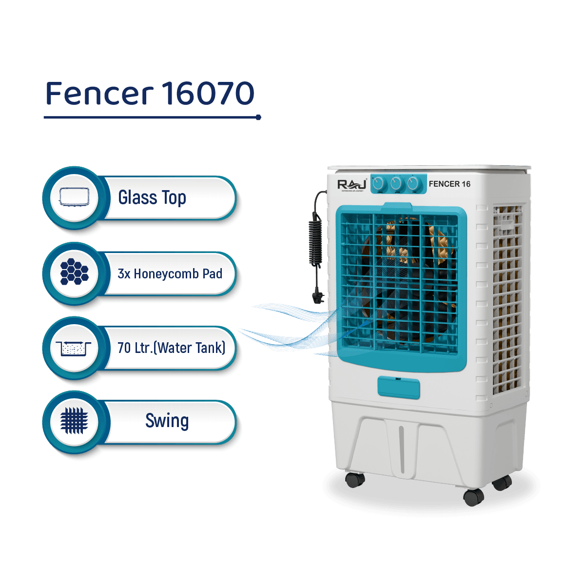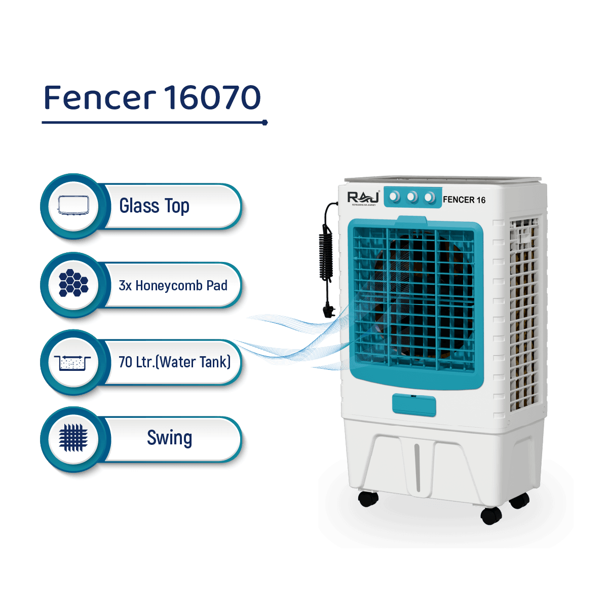 The Fencer 16070 is a high-performance air cooler designed to deliver exceptional cooling for rooms up to 700 sq. ft. Its powerful 205-watt motor and 40-feet air throw ensure even large spaces are cooled quickly and effectively. Whether it's for your living room, office, or commercial space, this cooler guarantees optimal performance.
