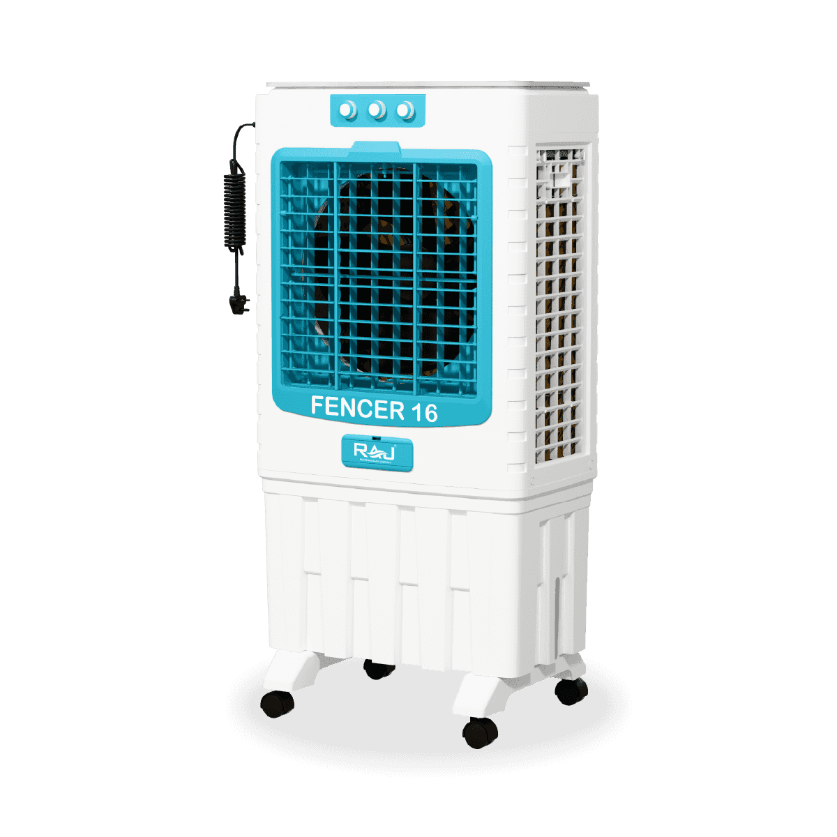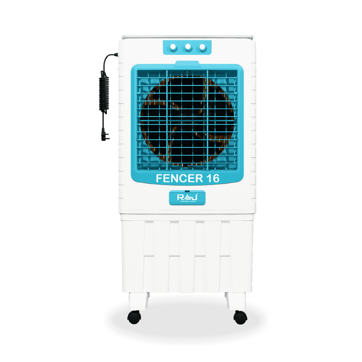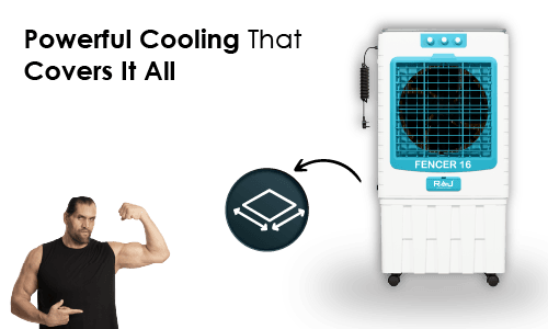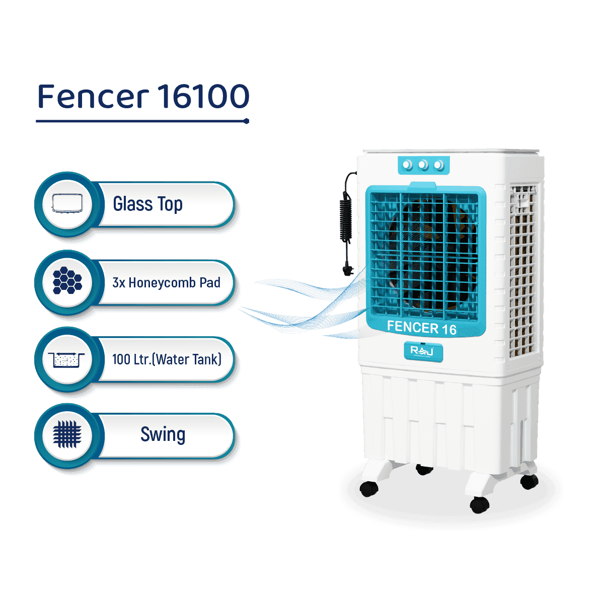The FENCER 16100 air cooler is designed to tackle heat in larger living or working areas. With a powerful motor and 40-feet air throw, it ensures uniform cooling across rooms up to 700 sq. ft.. This model is ideal for those seeking strong, consistent airflow in large spaces without compromising on energy efficiency.