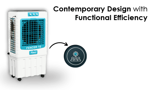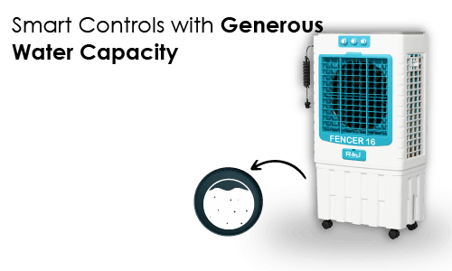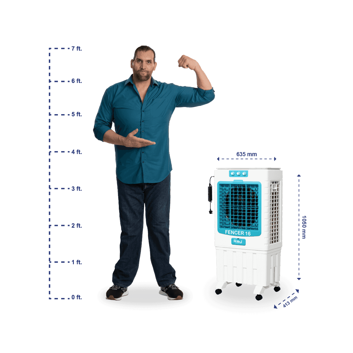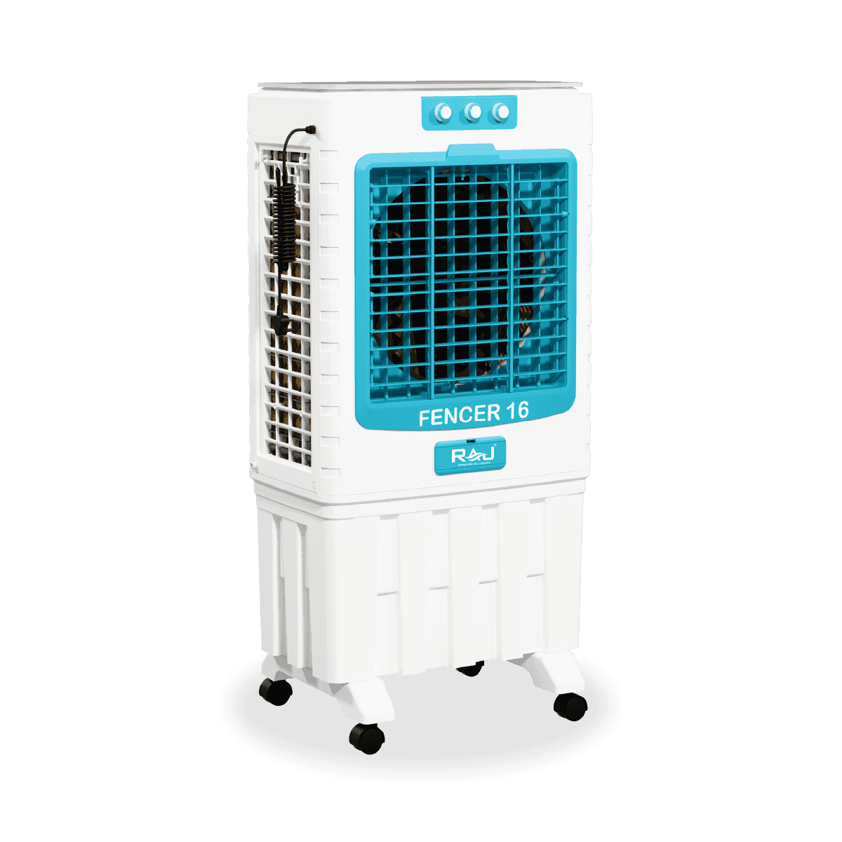 The FENCER 16100 air cooler is designed to tackle heat in larger living or working areas. With a powerful motor and 40-feet air throw, it ensures uniform cooling across rooms up to 700 sq. ft.. This model is ideal for those seeking strong, consistent airflow in large spaces without compromising on energy efficiency.