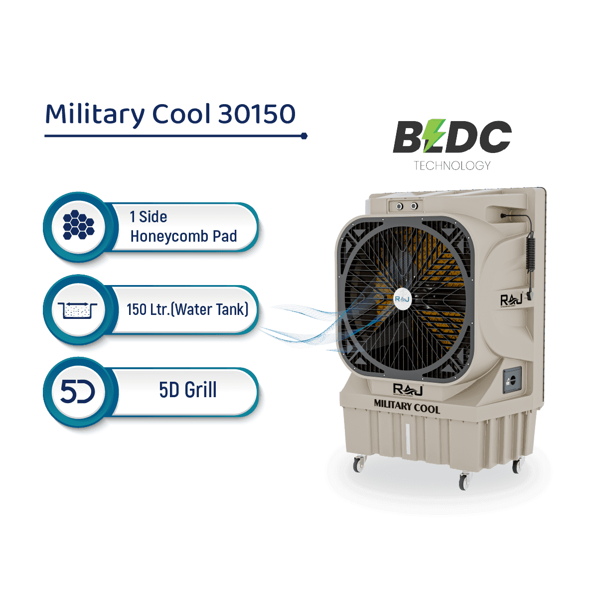 With a powerful 0.75 HP motor, the Military Cooler ensures robust cooling for extra-large spaces up to 2000 sq. ft.