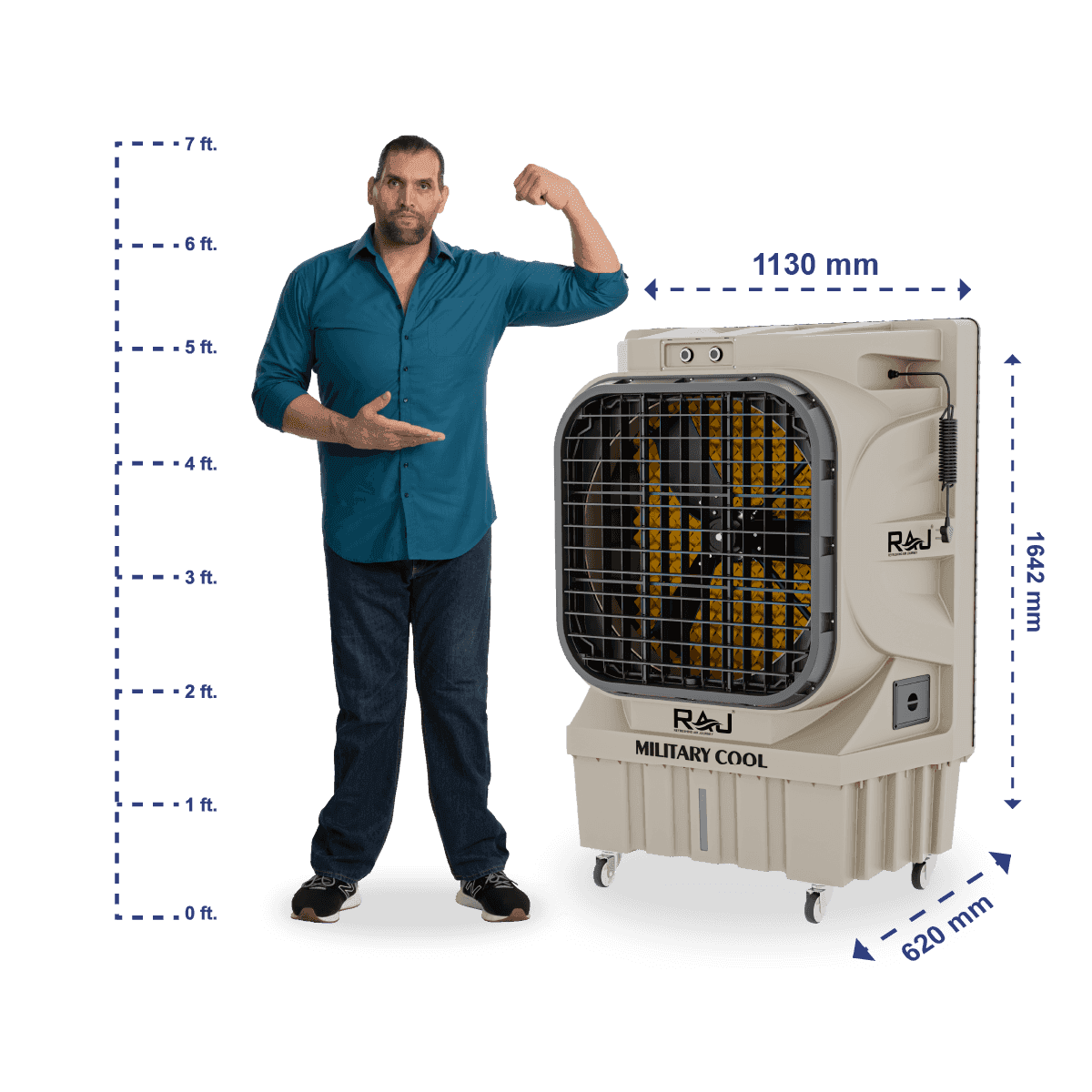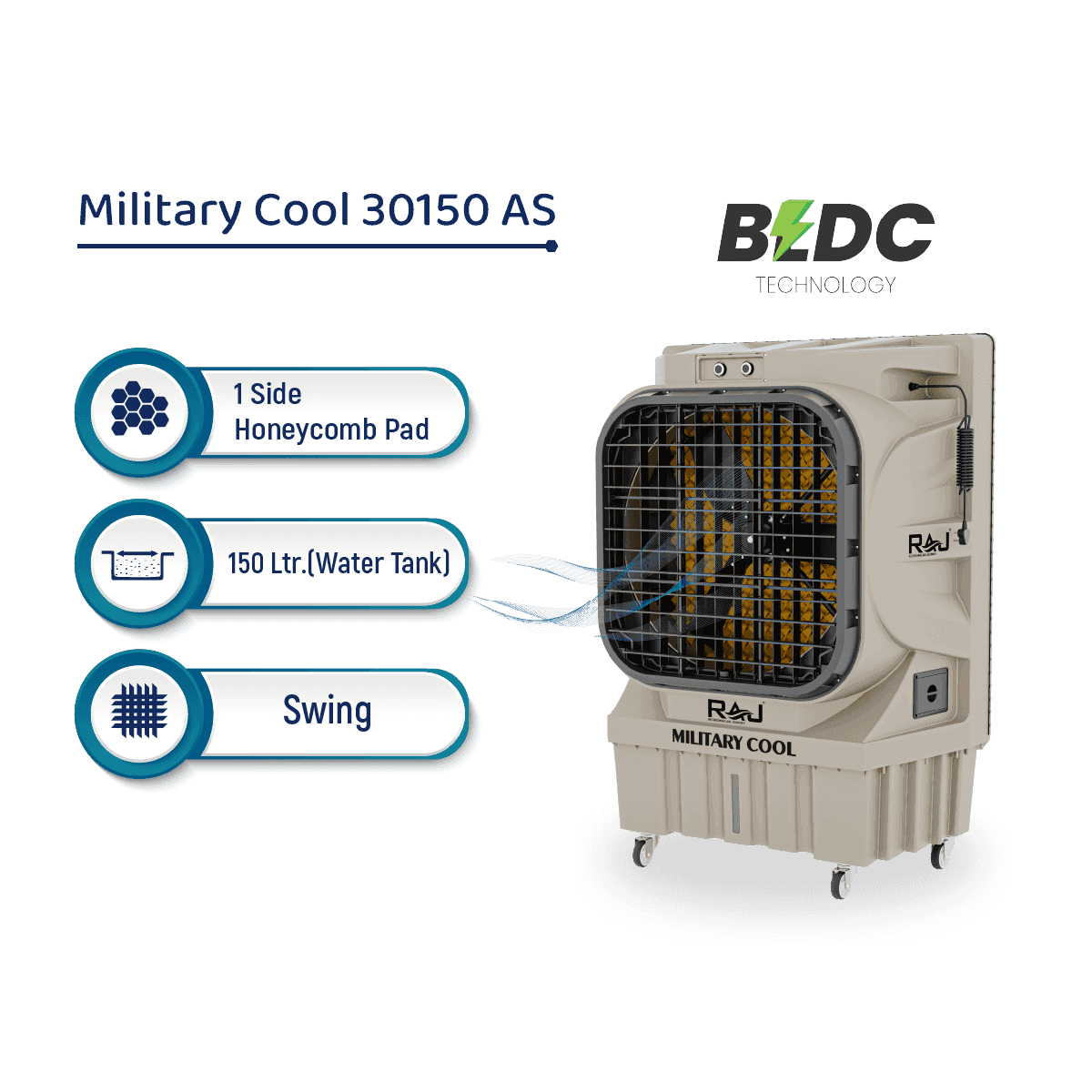 The MILITARY COOL AS 150 features a jet air throw mechanism, enabling strong and focused airflow across large spaces. This ensures instant cooling, making it ideal for industrial applications, event spaces, and commercial areas.