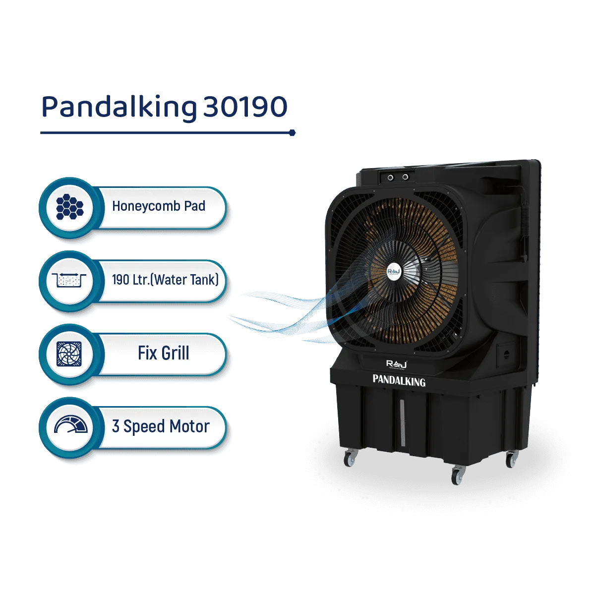The PANDALKING 30190 is designed for those who need intensive and continuous cooling across massive spaces. With an enormous 190-litre water tank, it ensures uninterrupted cooling without frequent refills, making it ideal for events, halls, or warehouses. The honeycomb cooling pads enhance the cooling efficiency, delivering fresh, humidified air that keeps the environment pleasant.