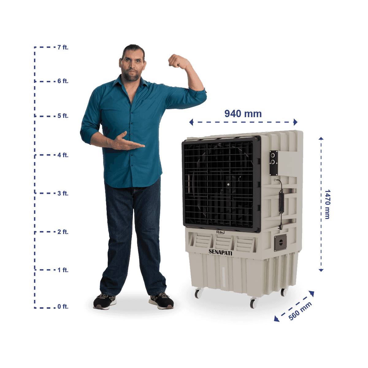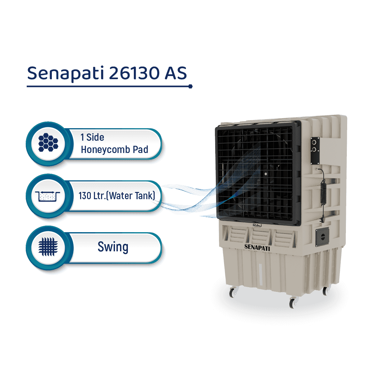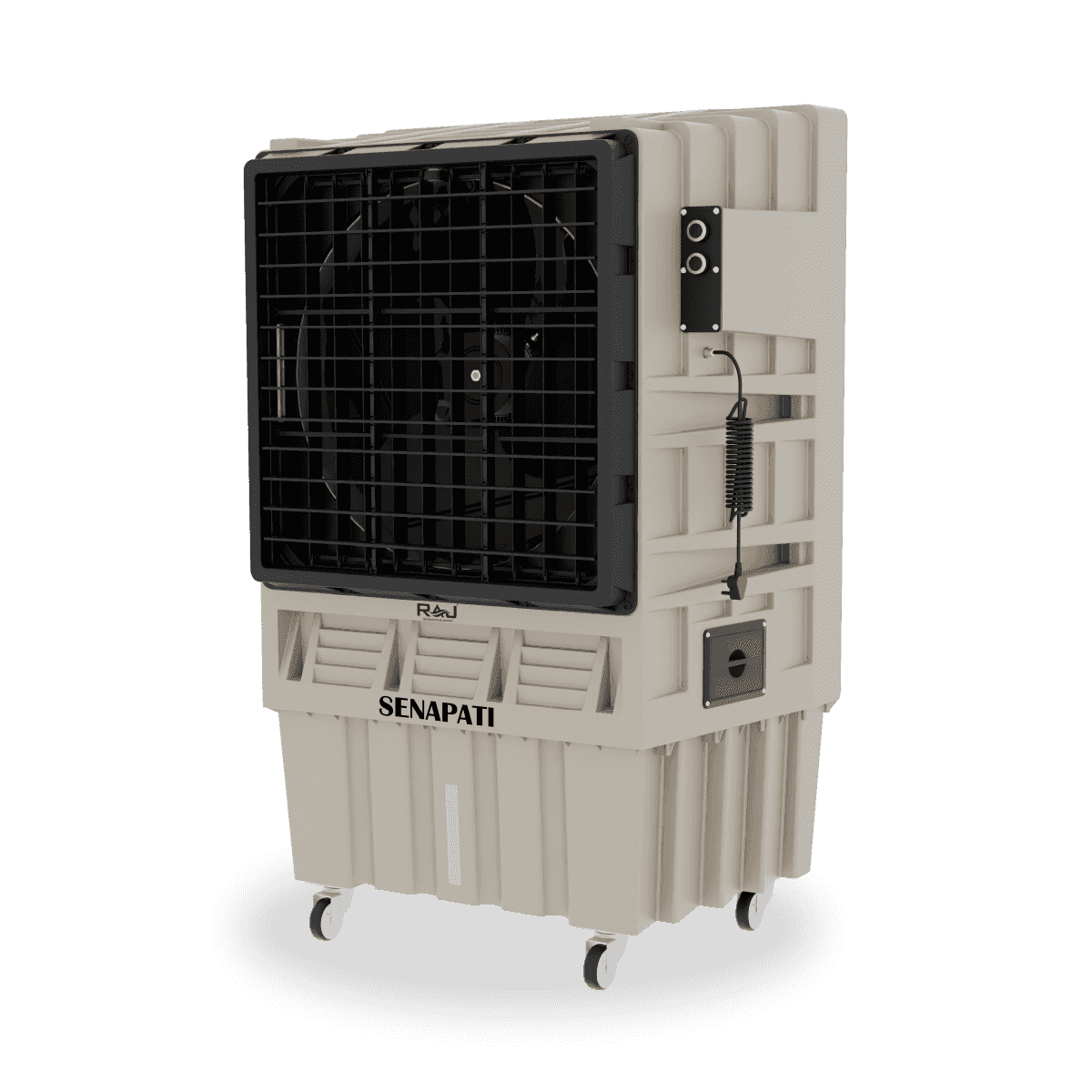 The SENAPATI AS 130 is a high-performance industrial air cooler designed for large areas up to 700 sq. ft.. With a 120L water tank, 0.65 HP motor, and 500W power consumption, it ensures powerful and efficient cooling. Its rugged design makes it ideal for factories, warehouses, and outdoor events.