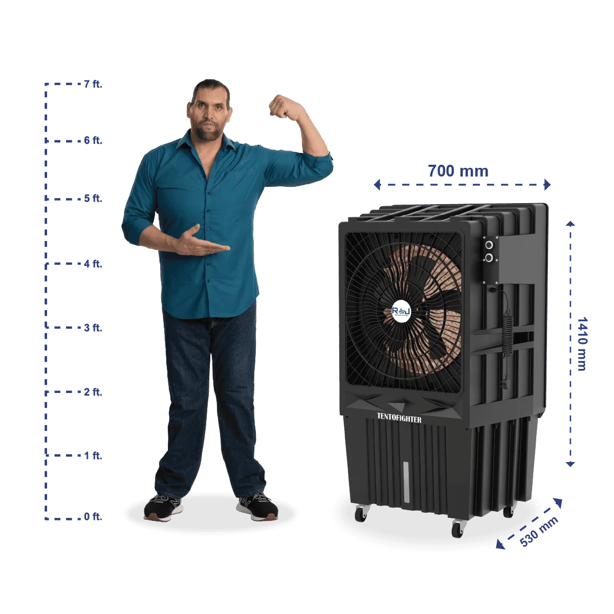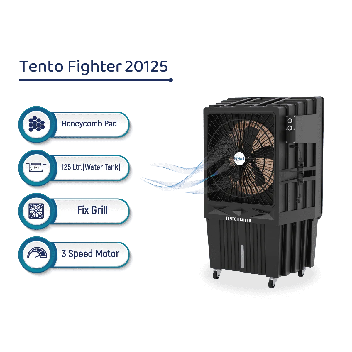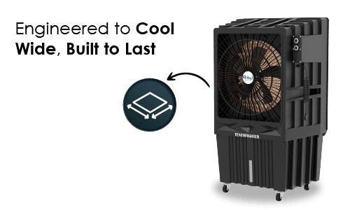 Introducing the TENTO FIGHTER 20 air cooler, designed for the tent industry. With a 3-speed motor, 125-liter capacity, and efficient 180W power consumption, it provides powerful, low-noise cooling at 1300 RPM. Perfect for outdoor settings, it ensures comfort in any tent environment.