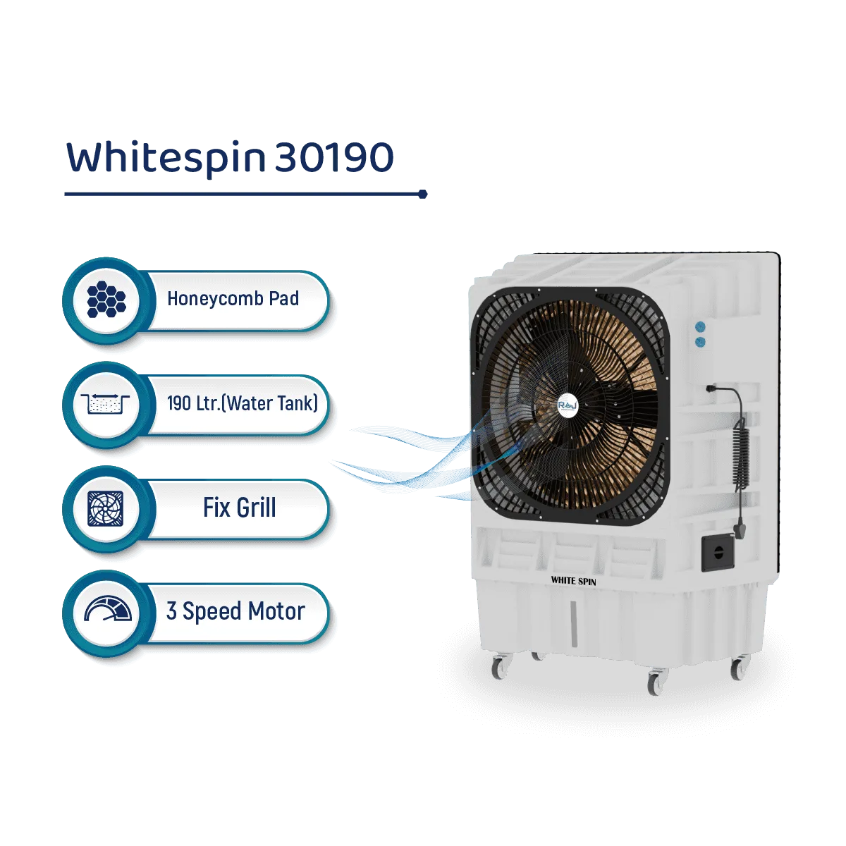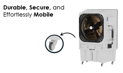 Built with a durable and sturdy exterior, the WHITESPIN 30190 is designed for longevity and safety. The fixed grill ensures protection while maintaining strong airflow. Thanks to its smooth-rolling wheels, moving the cooler between locations is hassle-free, providing flexibility and convenience wherever you need effective cooling.